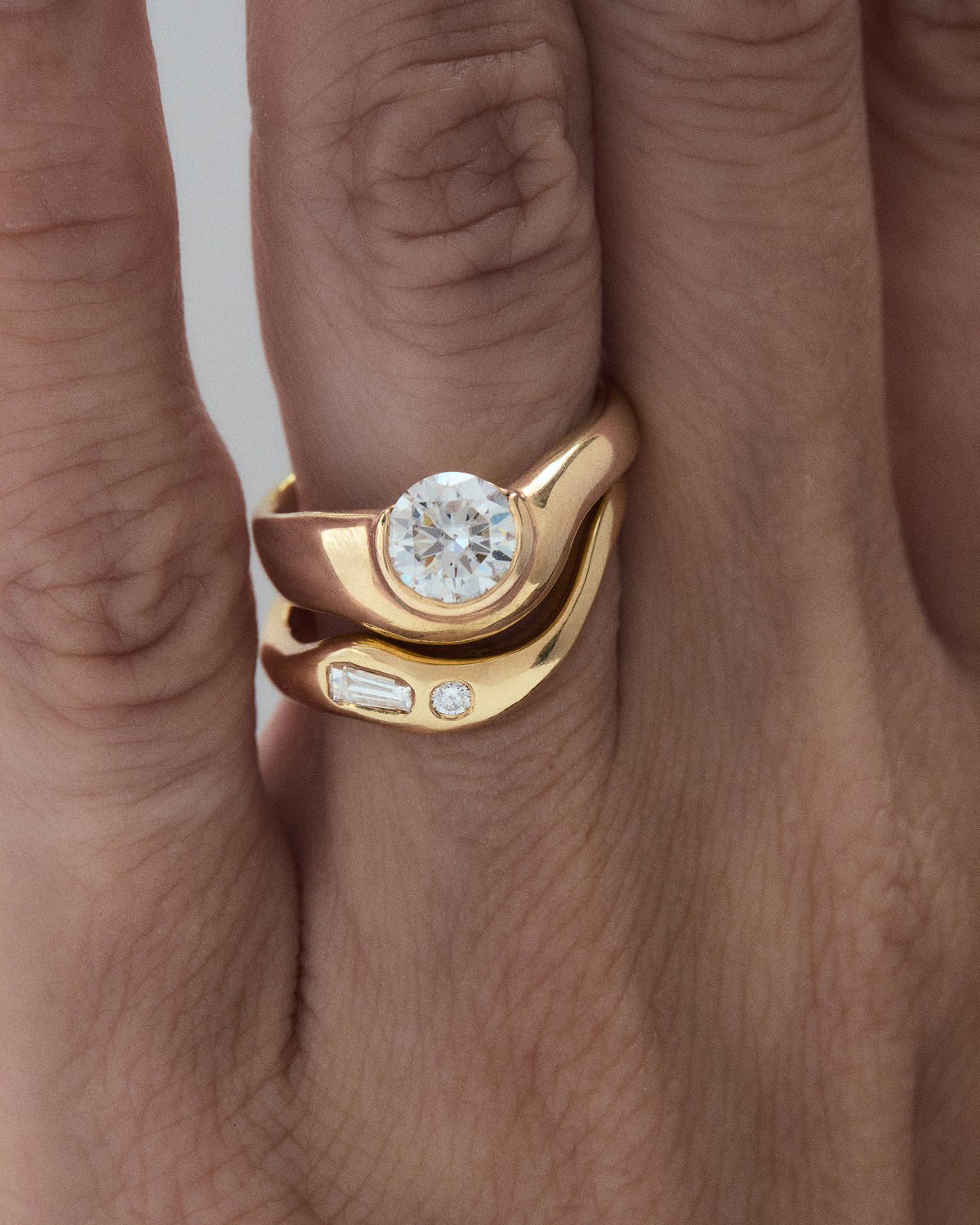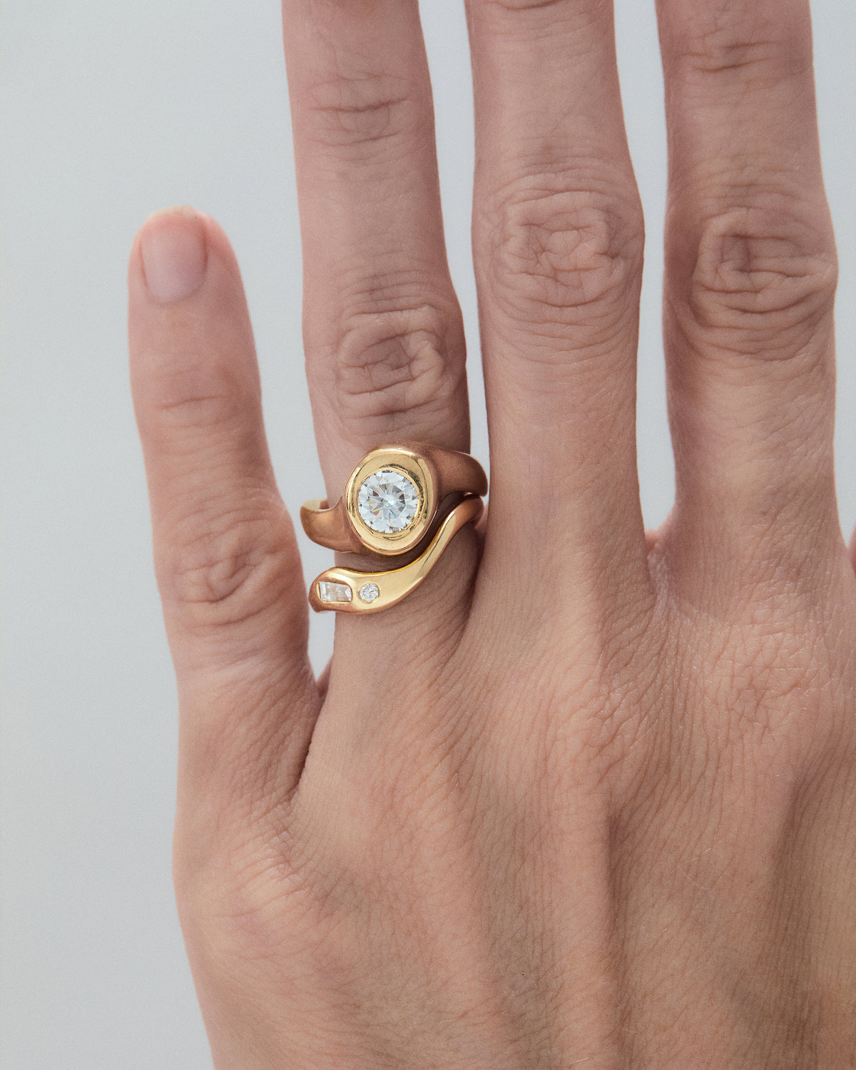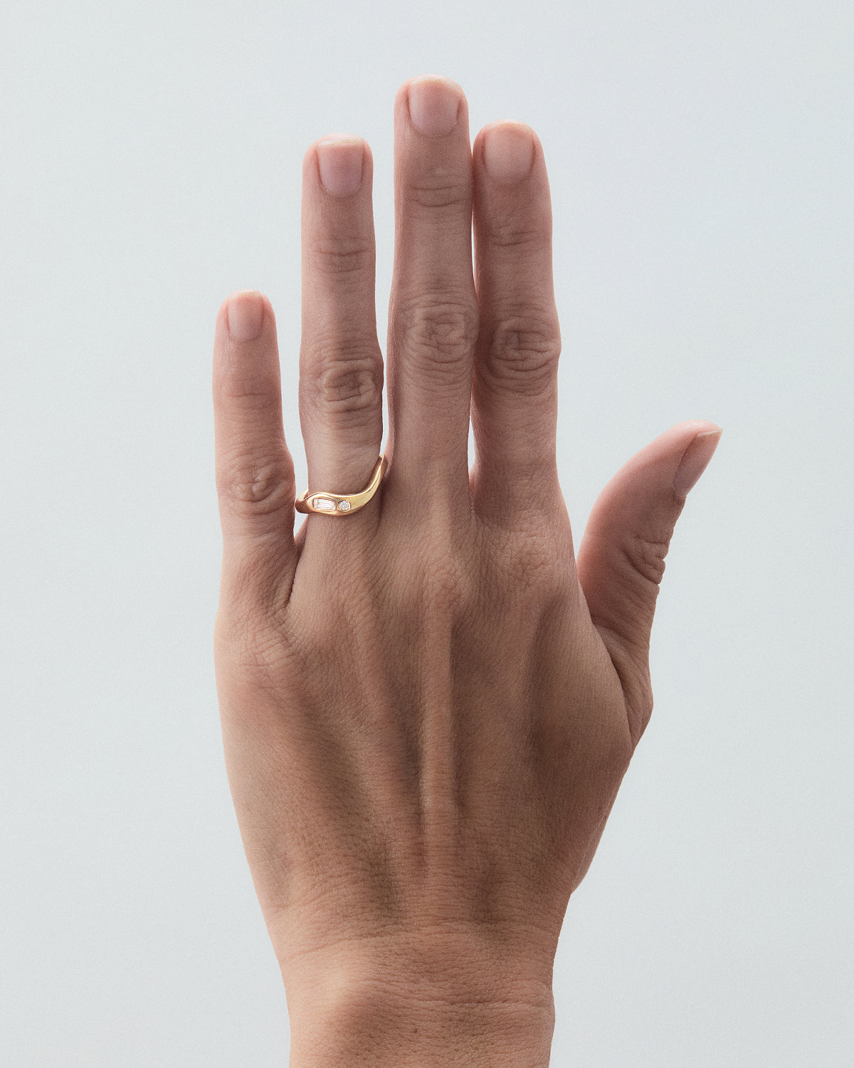 An irregular wavy band set with a total of 0.14 carats of natural diamonds that elevates any ring. Stacks beautifully with the Amada, Amor Mío, Noir Amor, Irregular Diamond Signet or the Vida Mía.