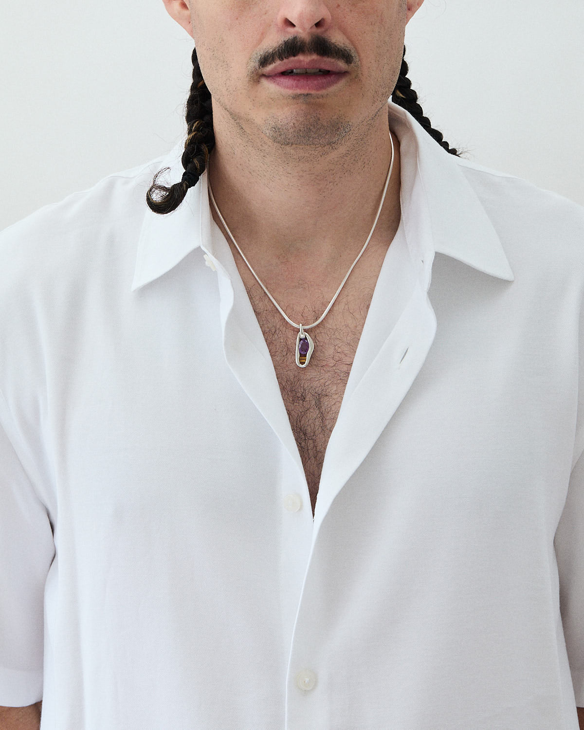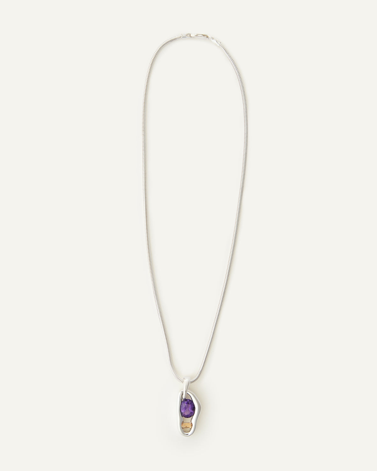 A necklace version of a classic cocktail ring. A natural amethyst paired with a citrine, suspended on a sterling silver organic pendant. Hangs from a sterling silver snake chain.