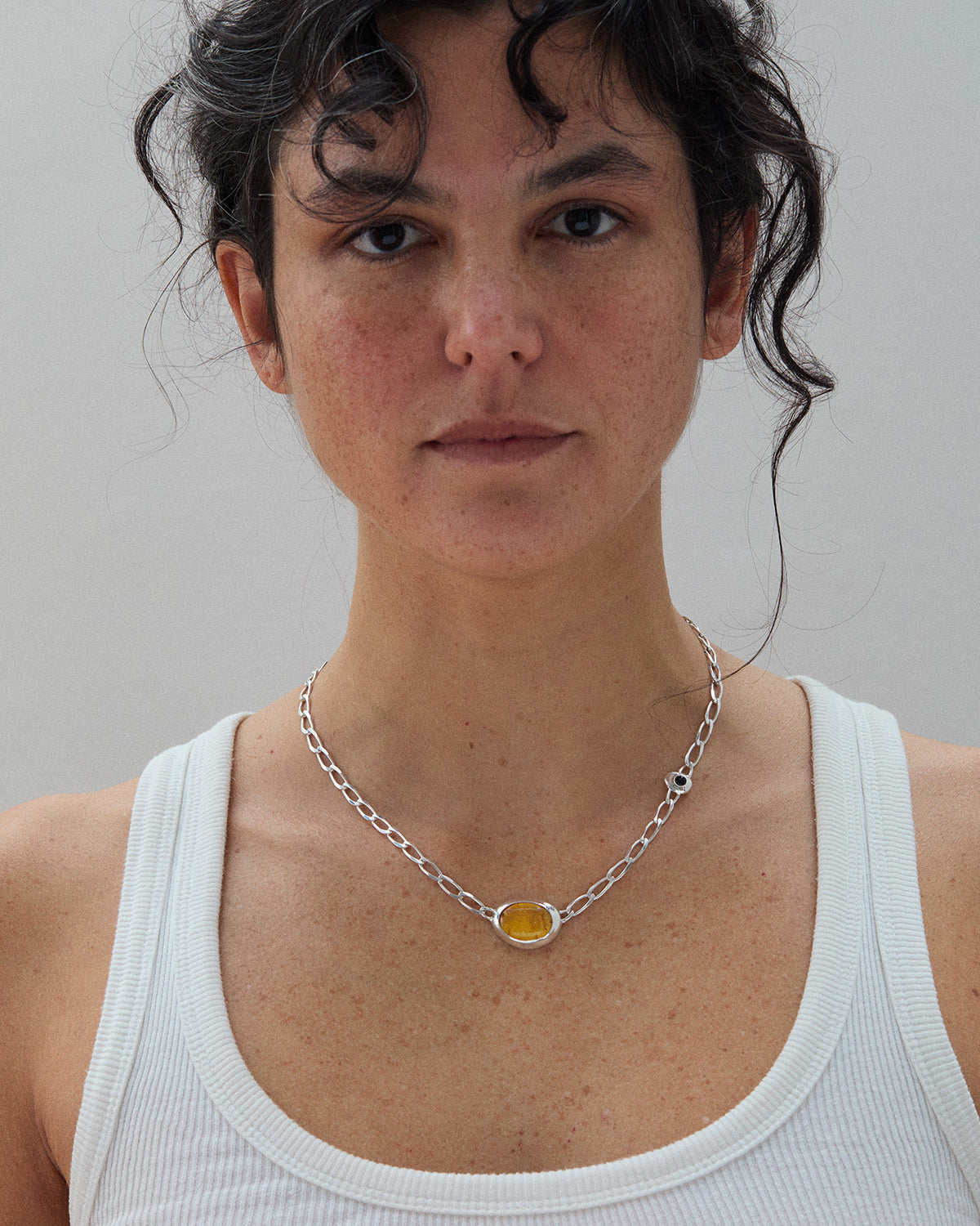 Balanced composition of two stones suspended on a delicate silver chain, secured with a distinctive hook closure. Effortlessly elegant, transitions seamlessly from day to night.