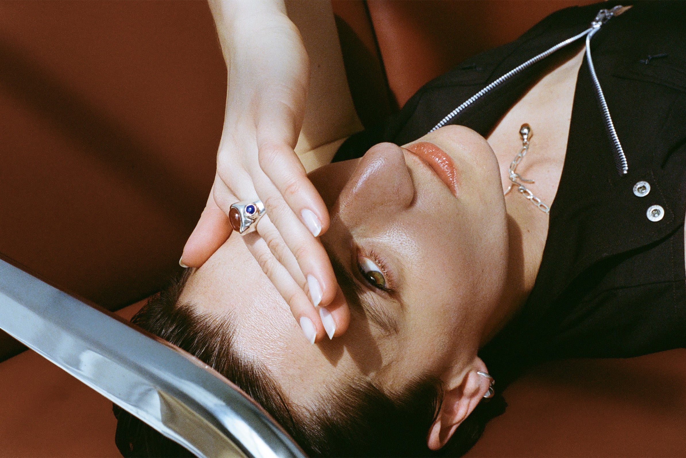 Sculptural ring pairing red onyx and lapis lazuli set in an irregular band. Bold yet understated, can be worn alone or styled with the Simple Pearl Ring.