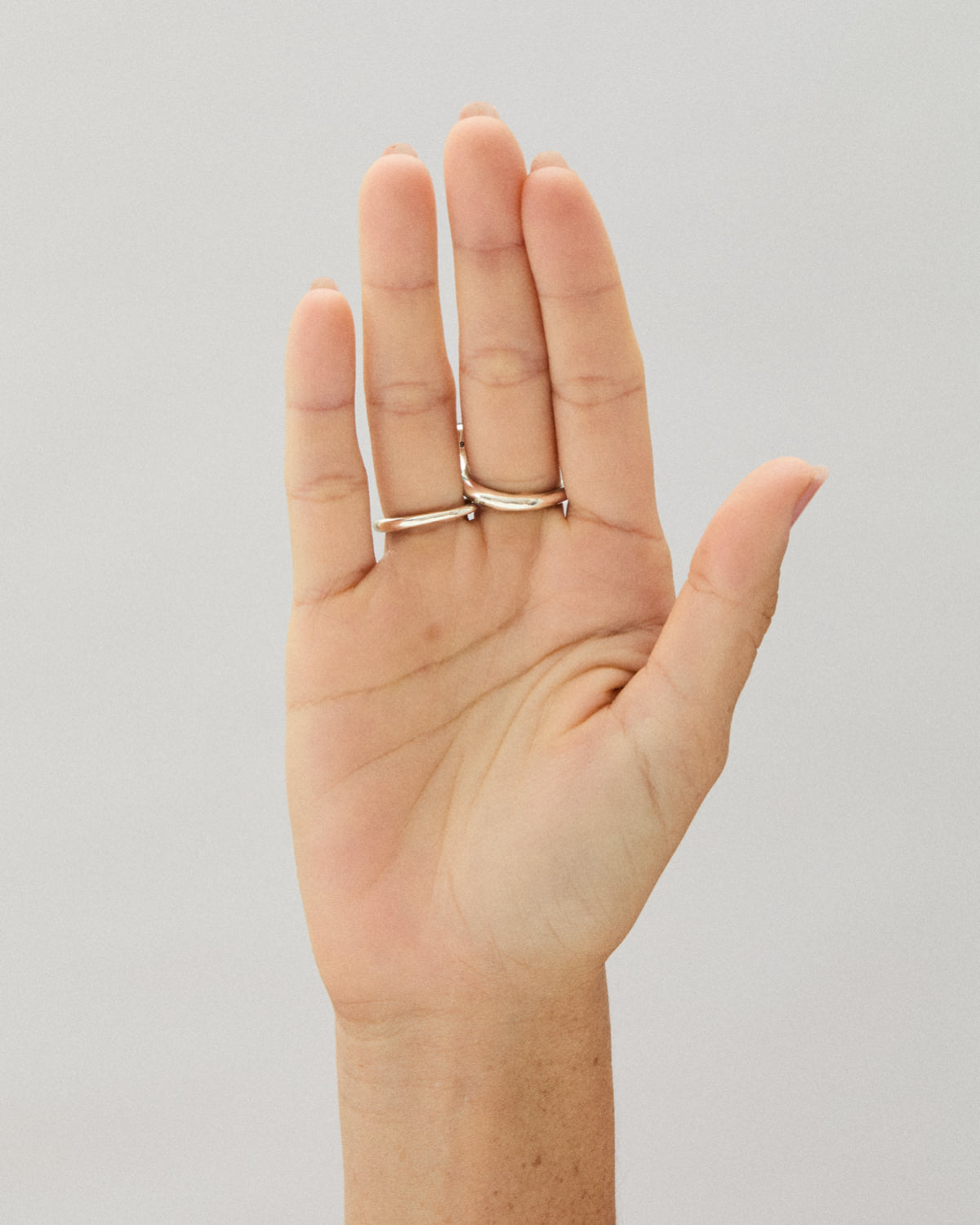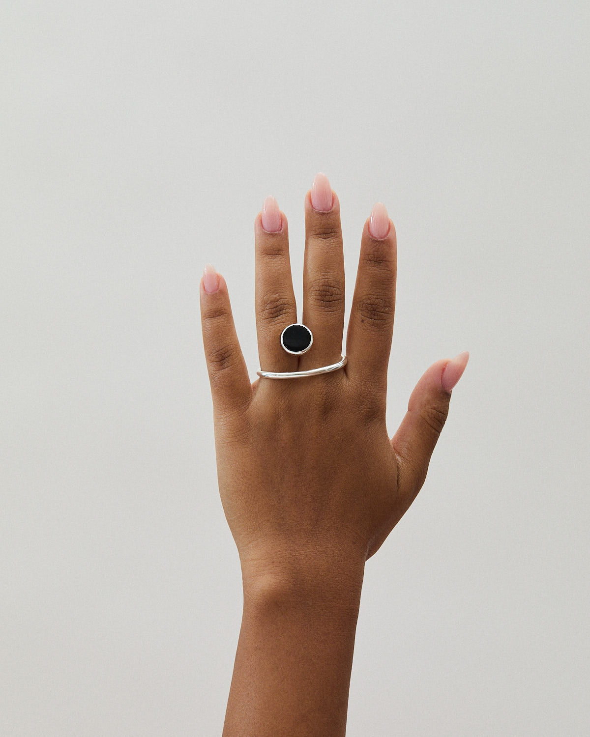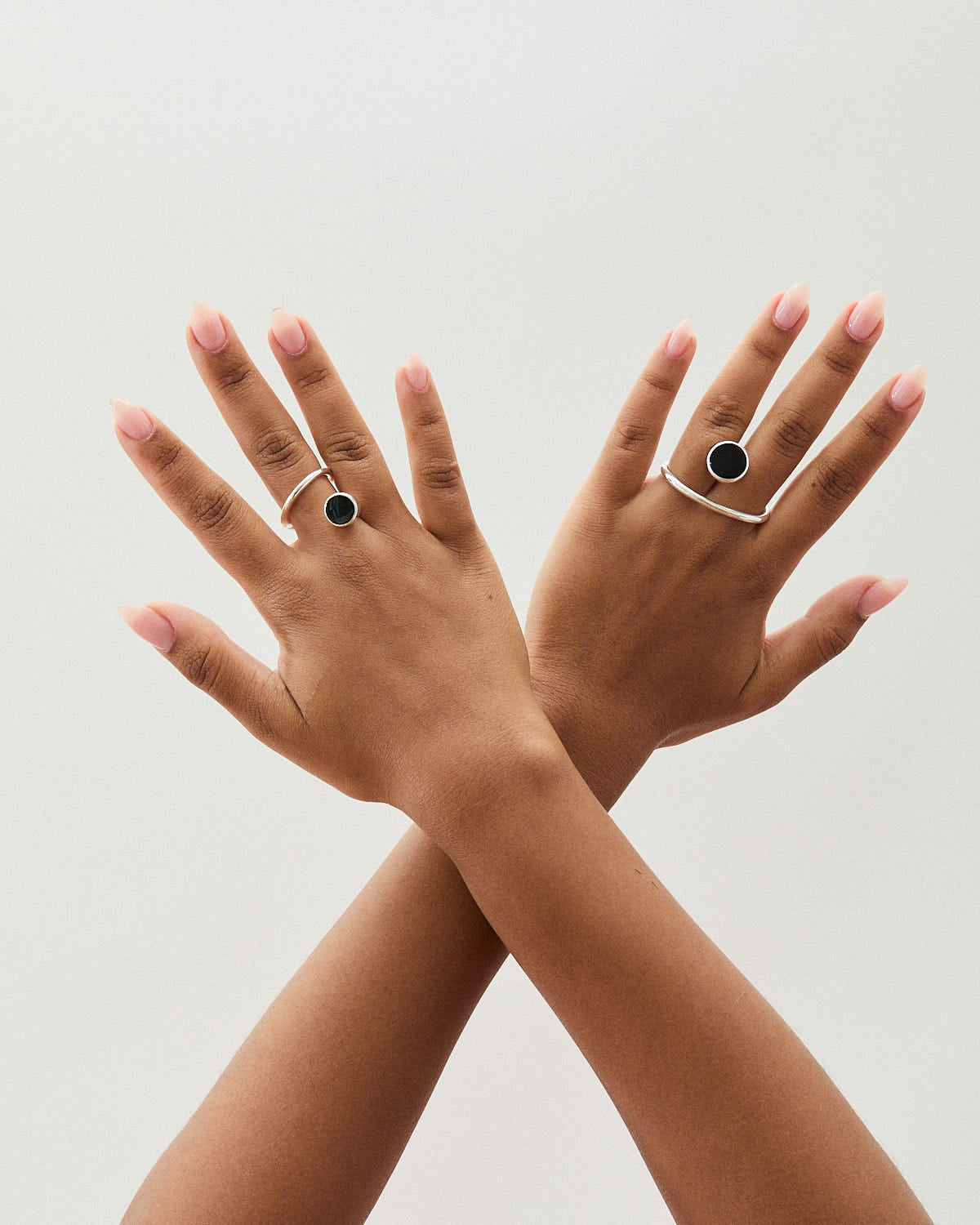 A double ring wraps around the fingers while an offset black agate stone is suspended in the middle of two fingers.