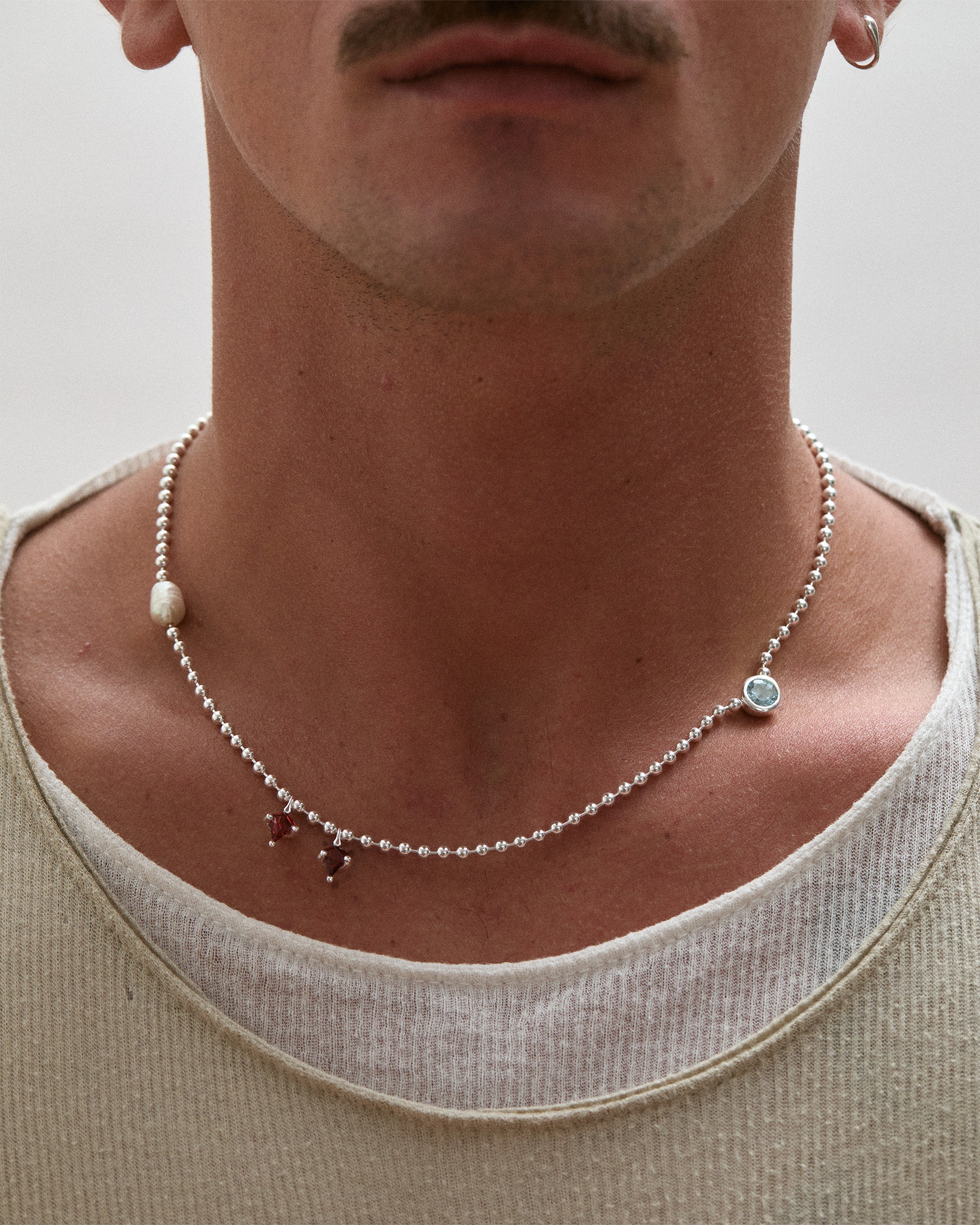 continuously adorned with aquamarine, garnet, and a baroque pearl. Made for everyday wear.