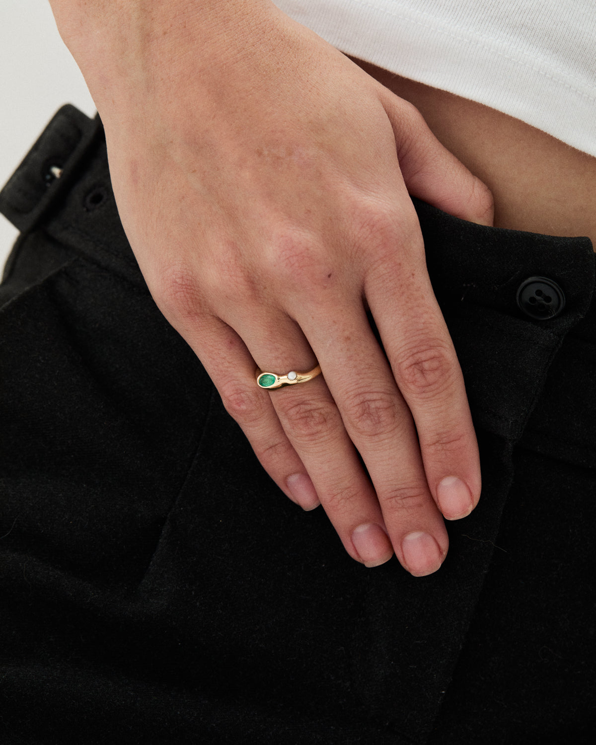 A natural 0.59cts Colombian emerald suspended along a small rounded freshwater pearl in a 14k irregular band. Made for daily wear, by itself or combined with a favorite.