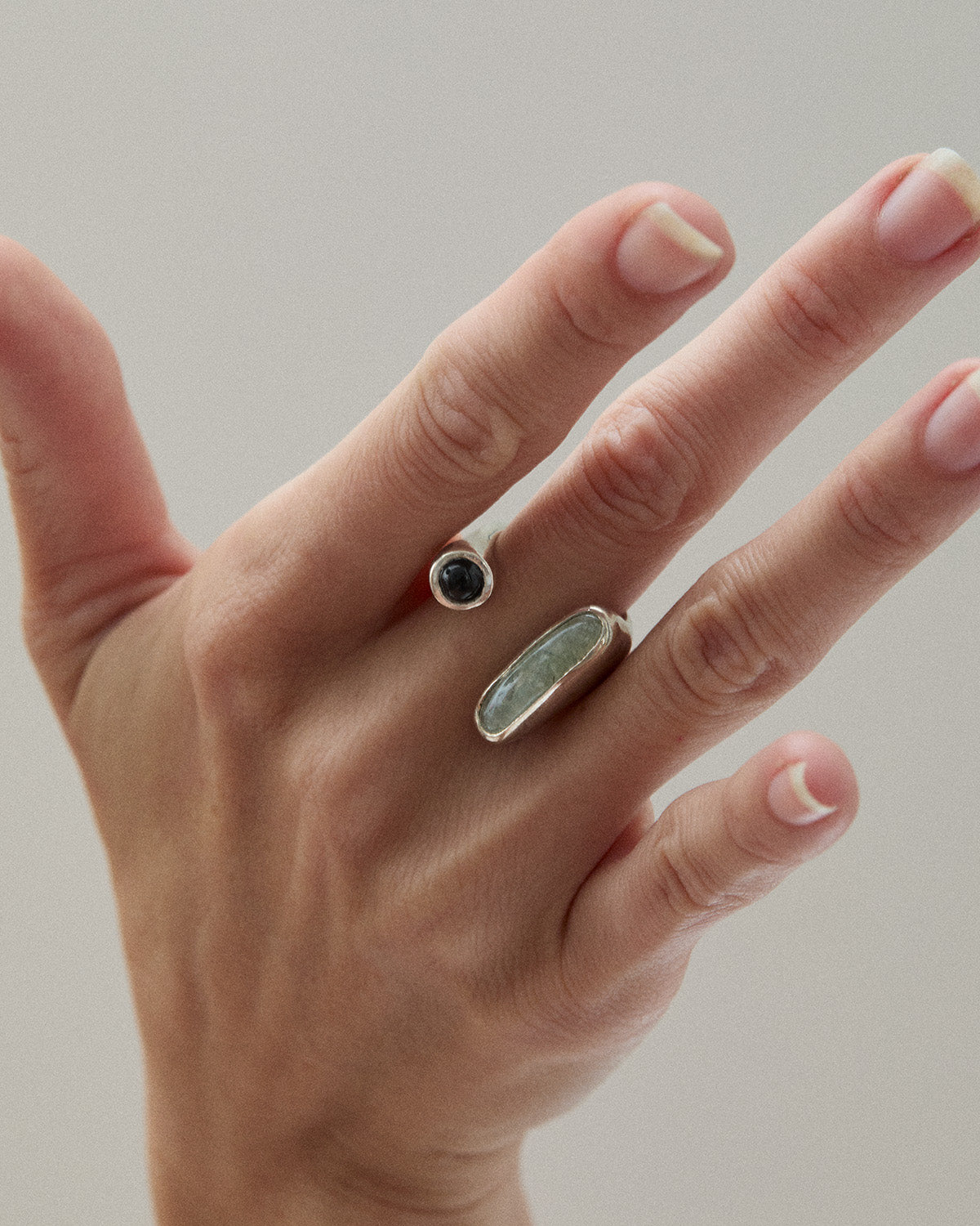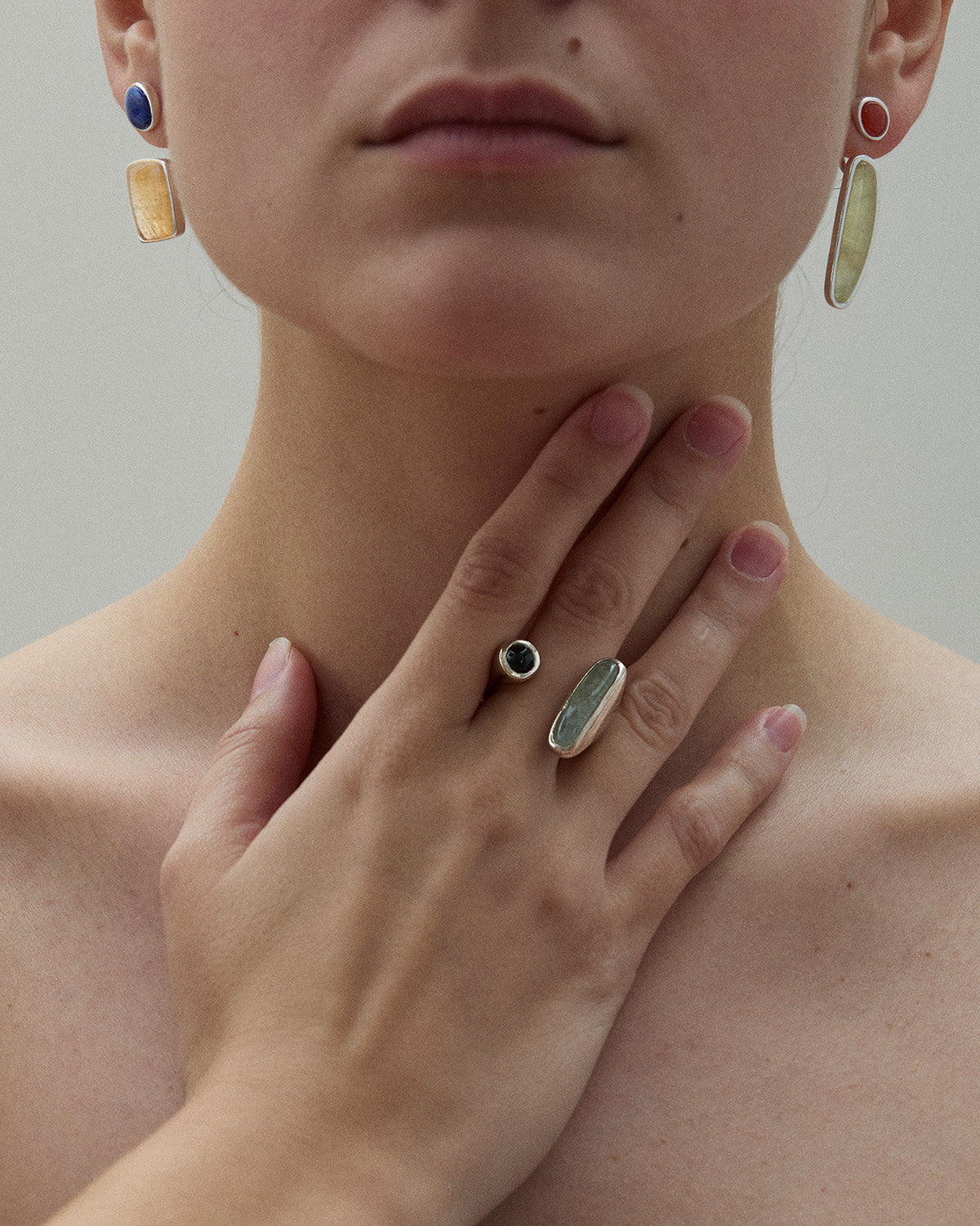 Two contrasting shapes suspended within the finger’s negative space, creating a floating illusion. Brings intention to even the simplest looks.