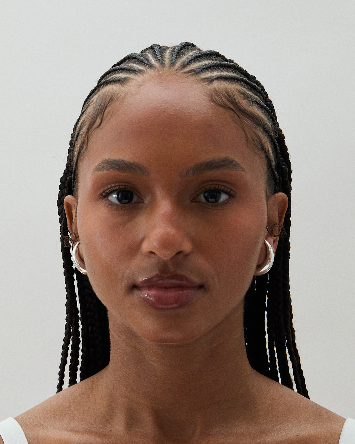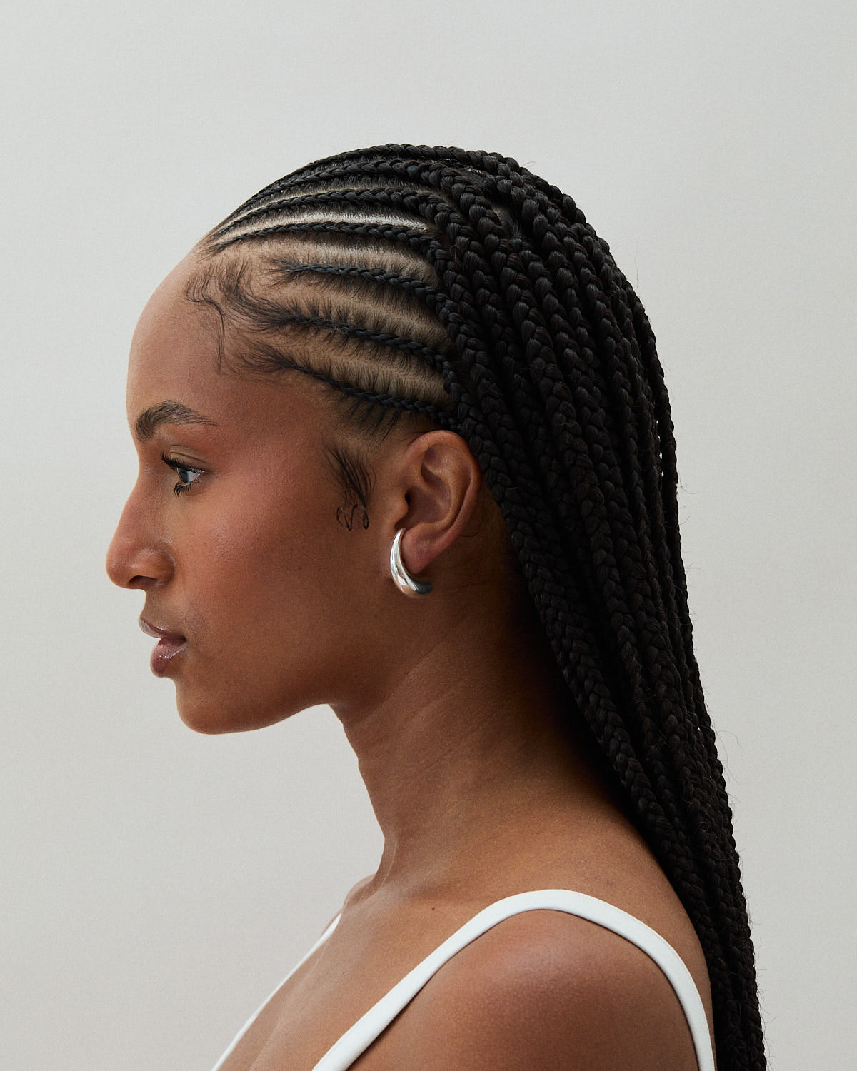 A set of chunky drop earrings that lay on the inside of the ear. Hollowed for lightweight wear.