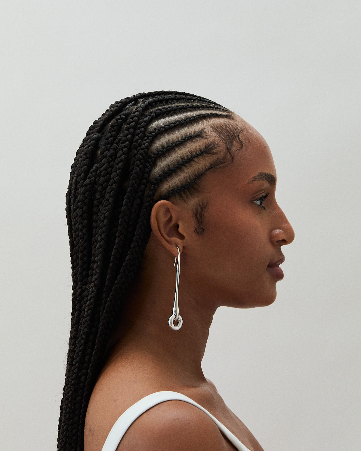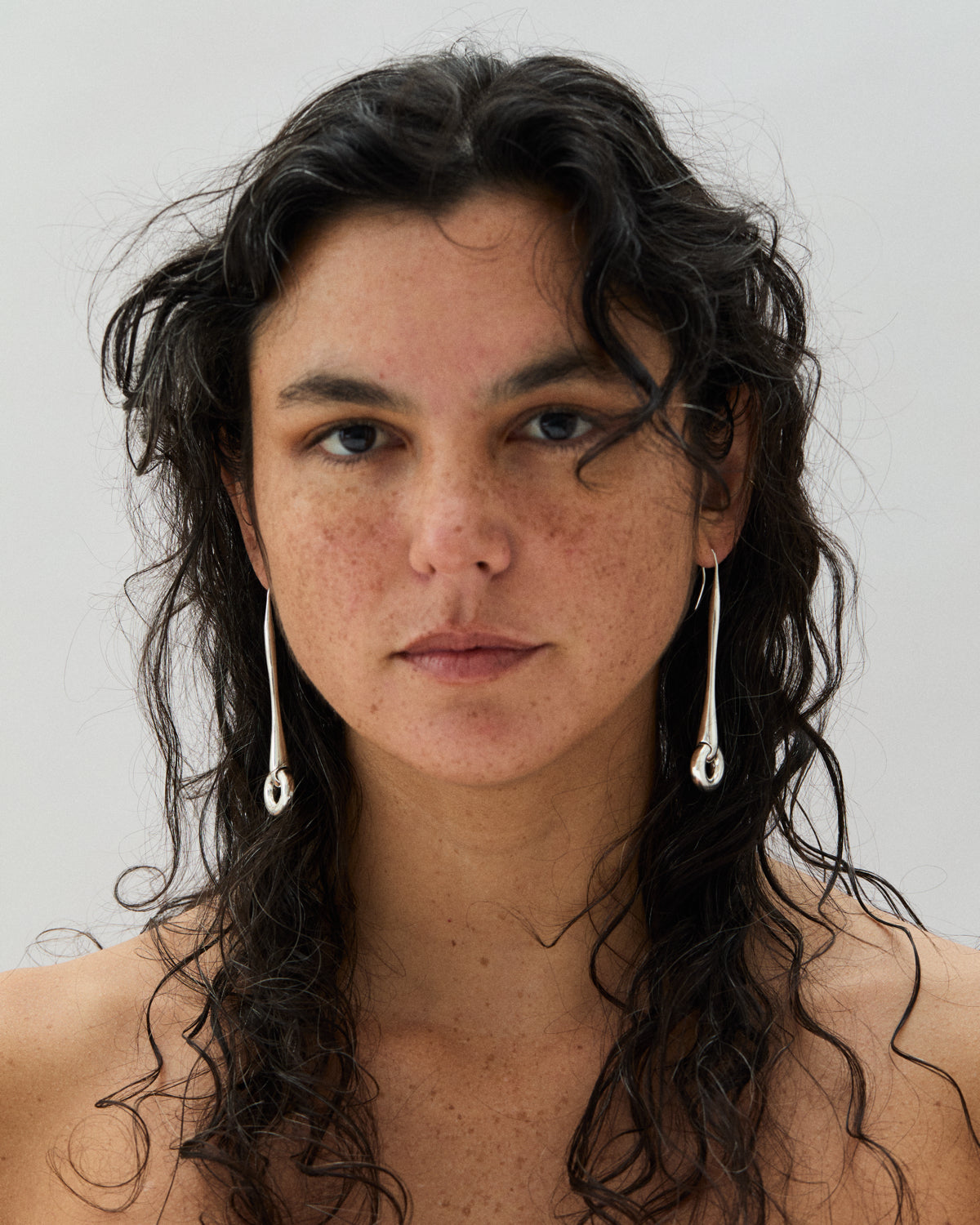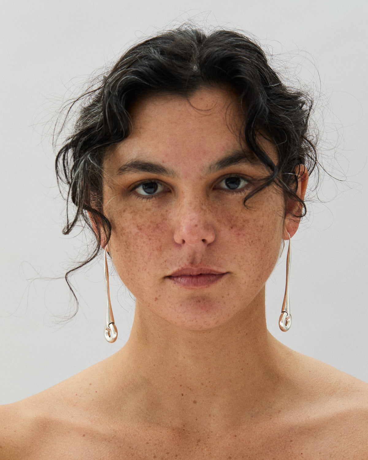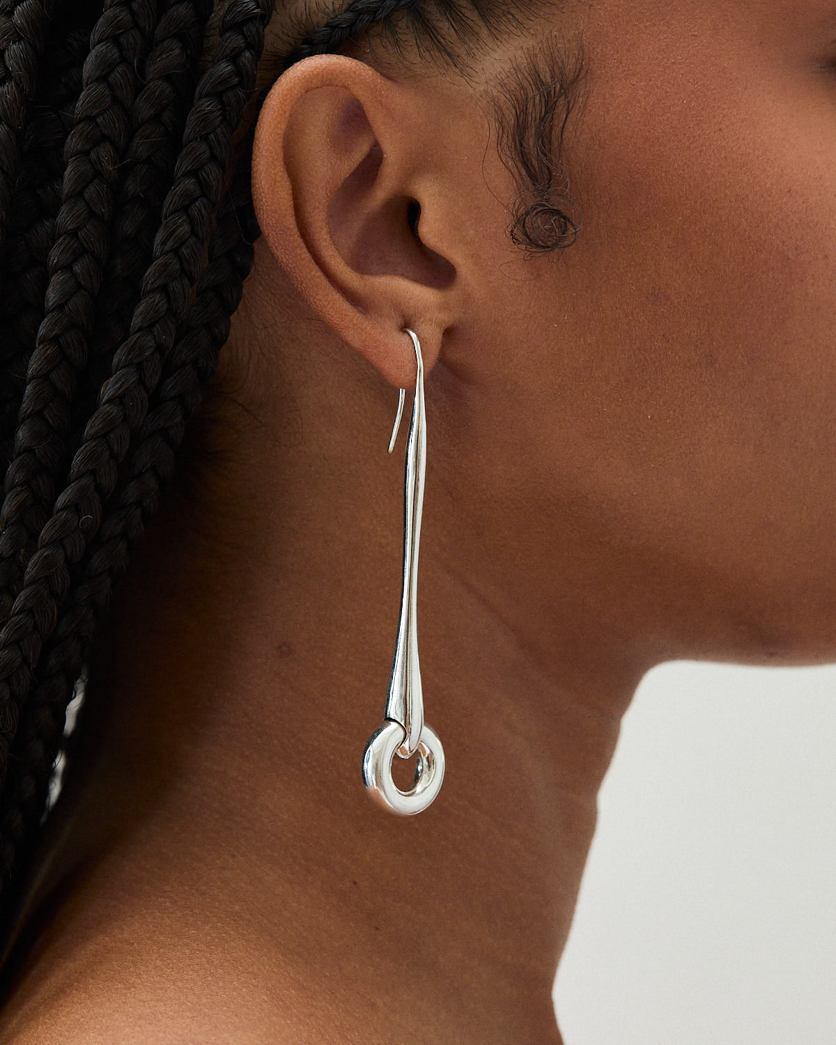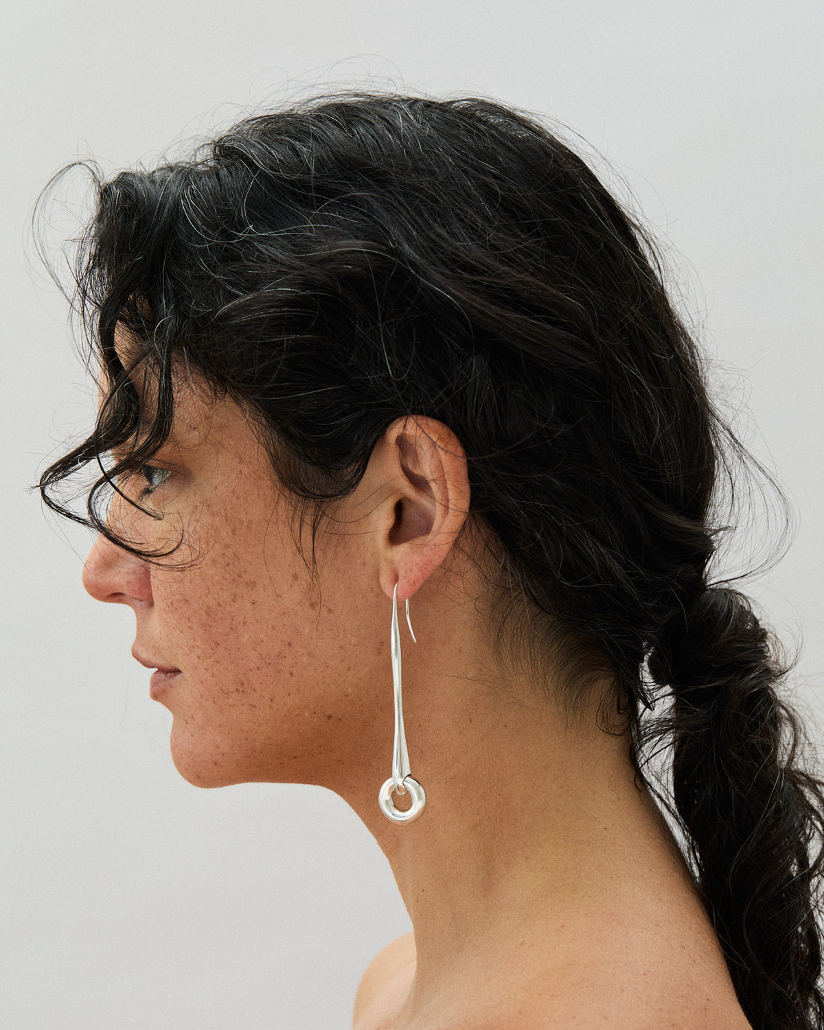 A contrast of shapes. A chunky geometric torus hangs from an elongated irregular base. Torus has movement. This piece is hollowed for a lightweight and comfortable feel.