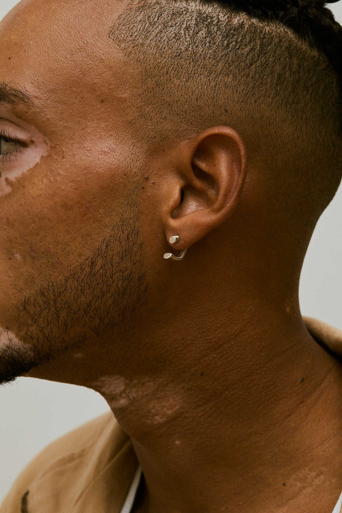 An irregular hoop passing through the ear and cut in the middle. Gives the illusion of an expanded perforation. Satin finish.