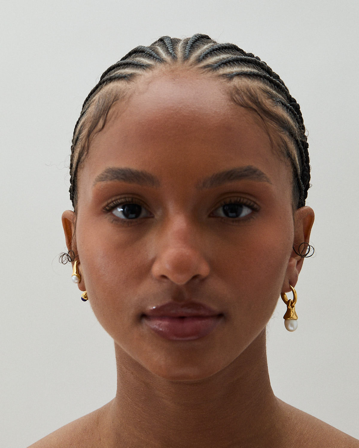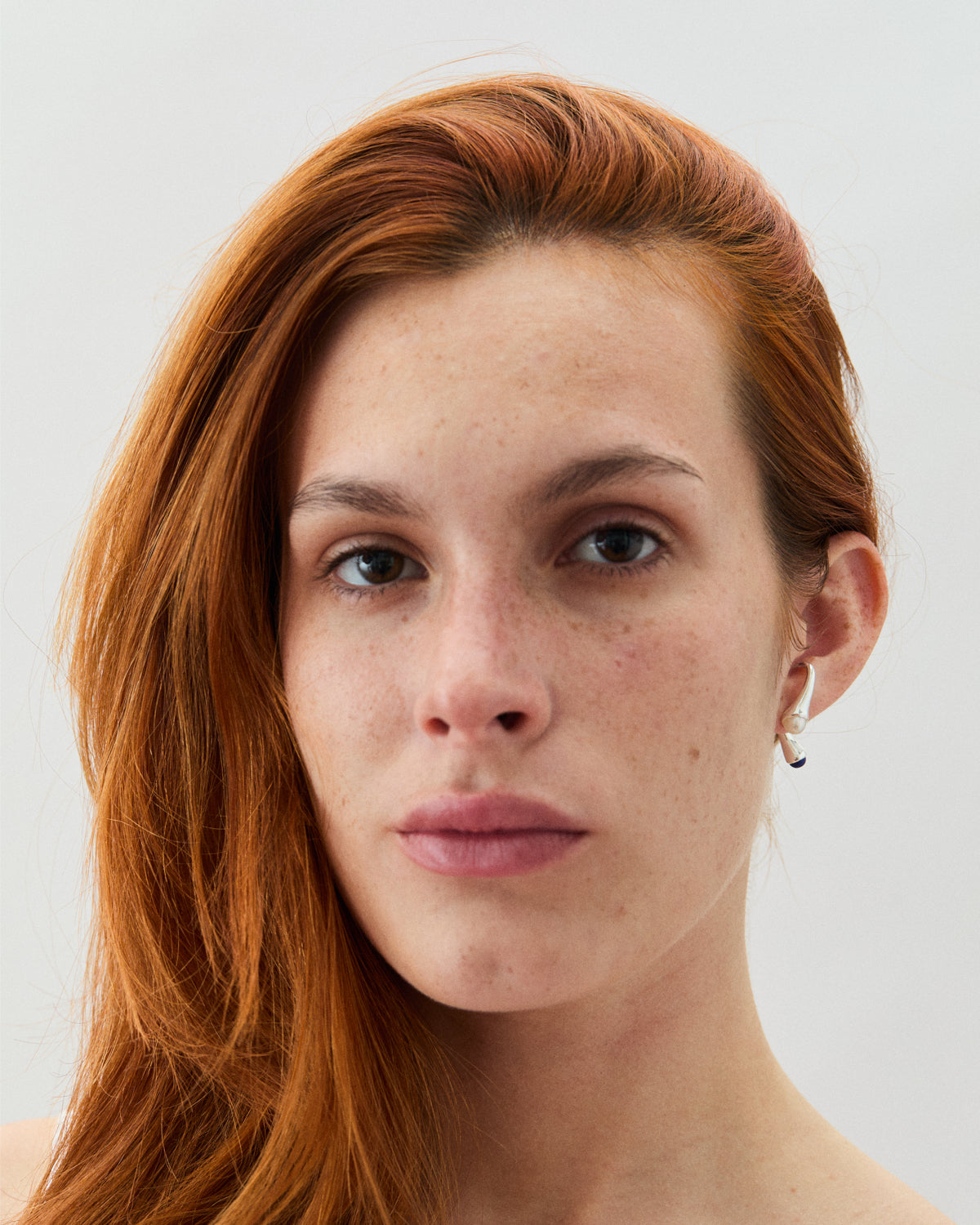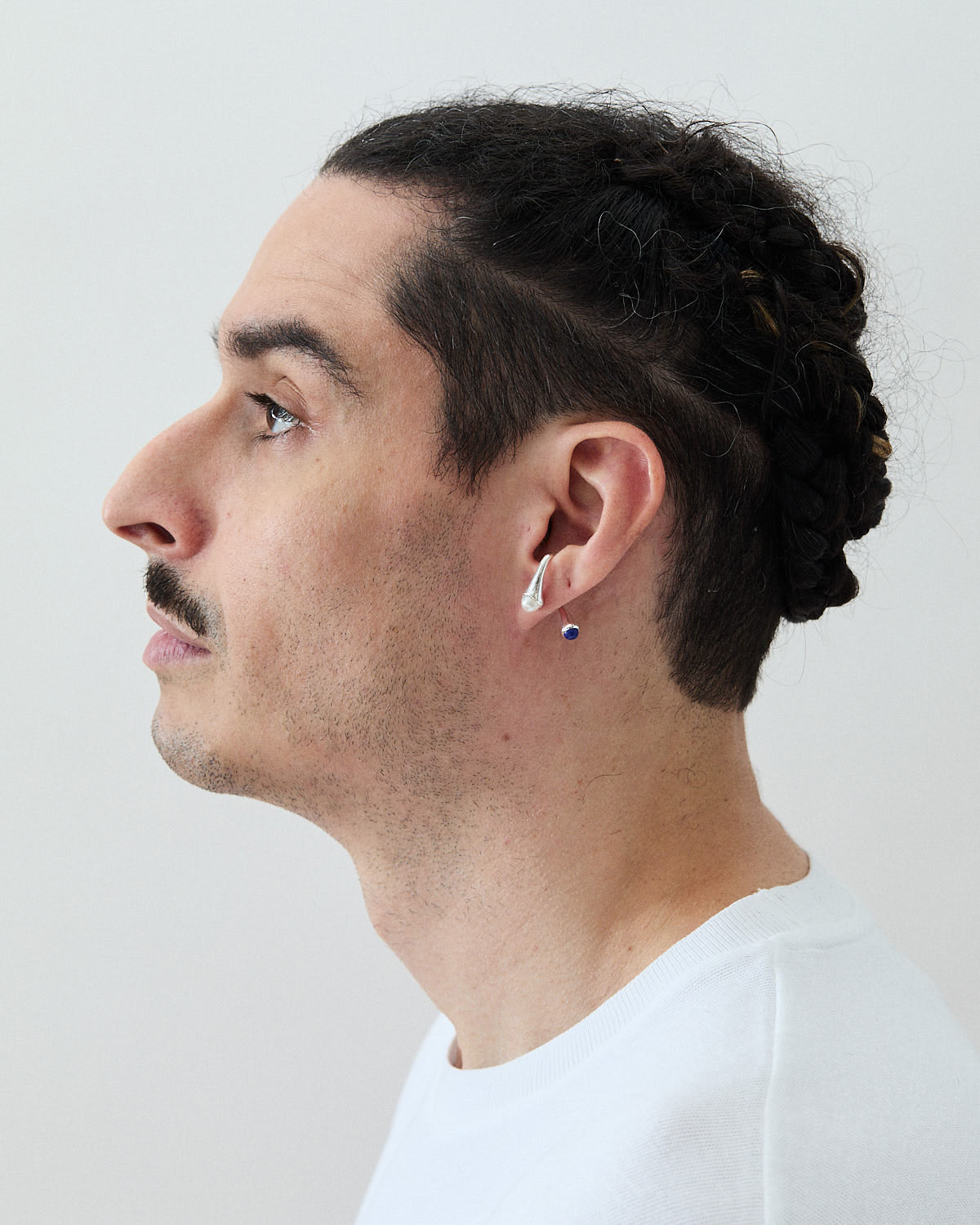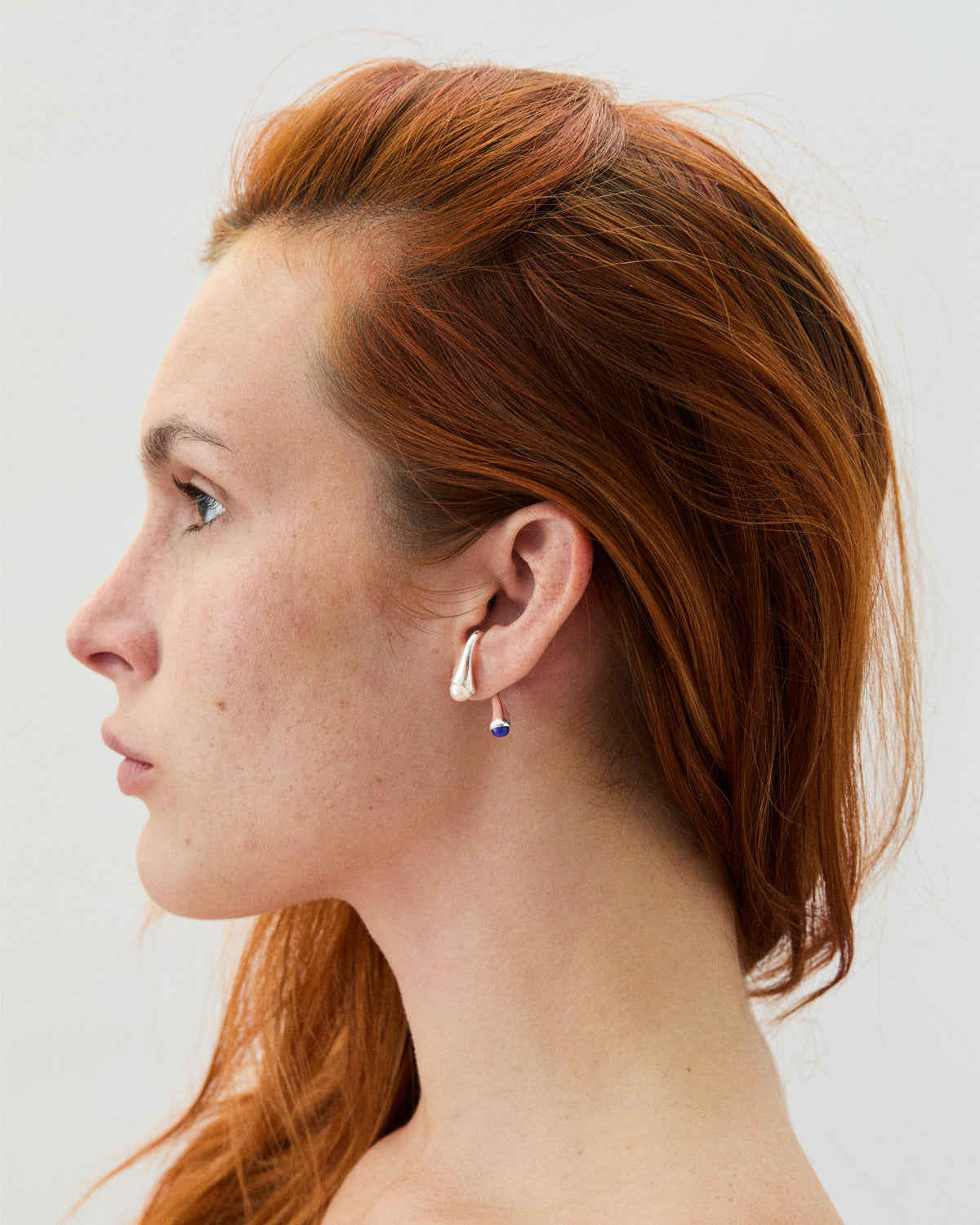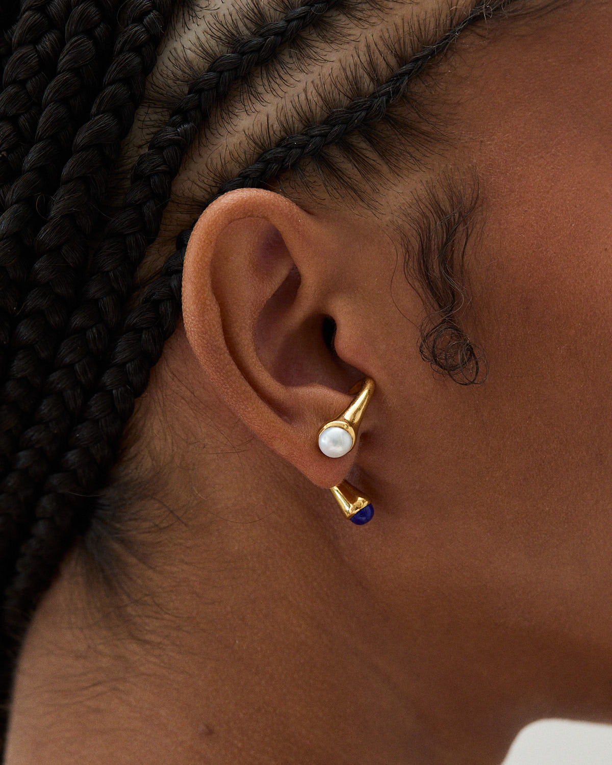 Two pieces become one open amorphous shape. Freshwater pearl and lapis lazuli over sterling silver or vermeil. For daily wear.