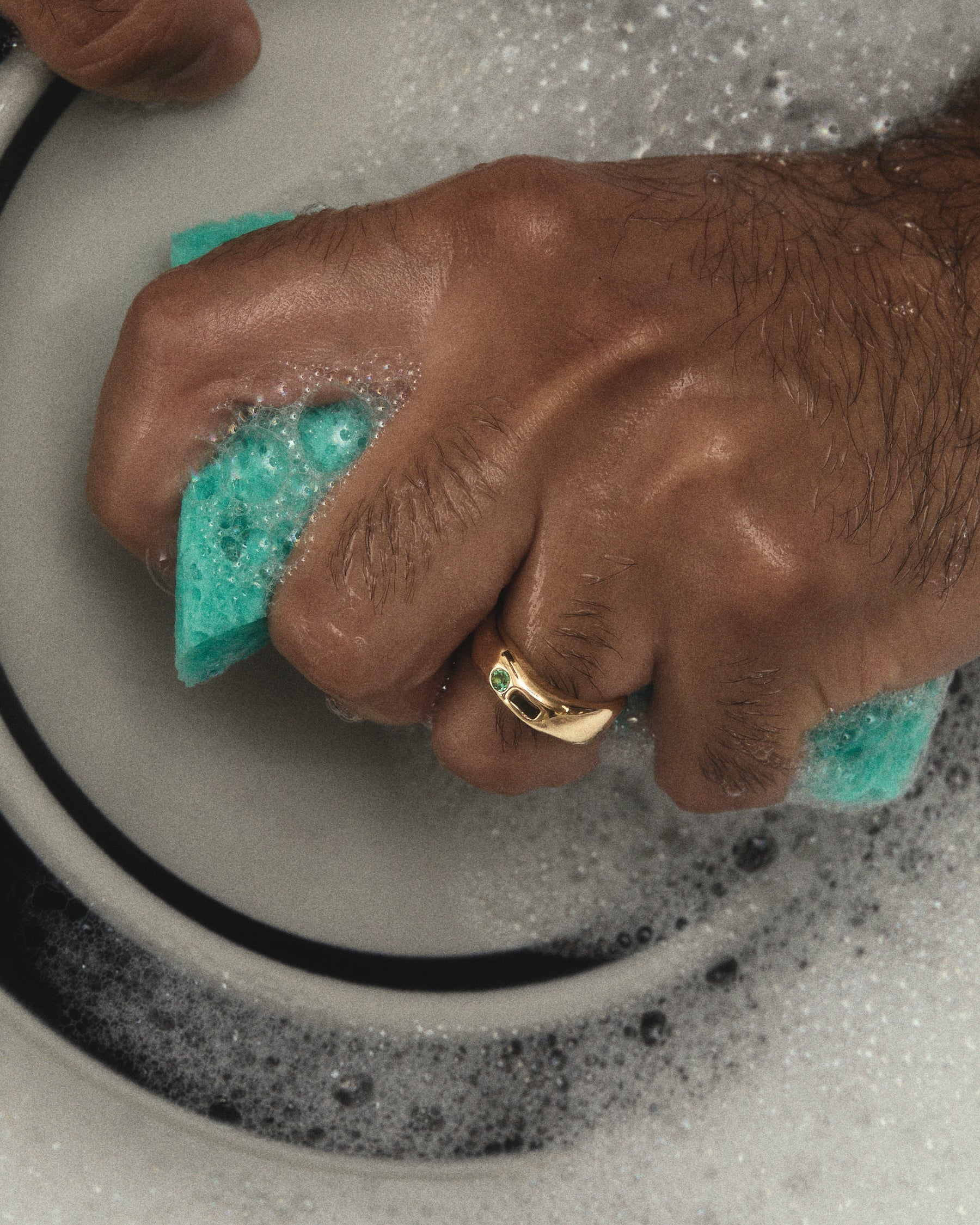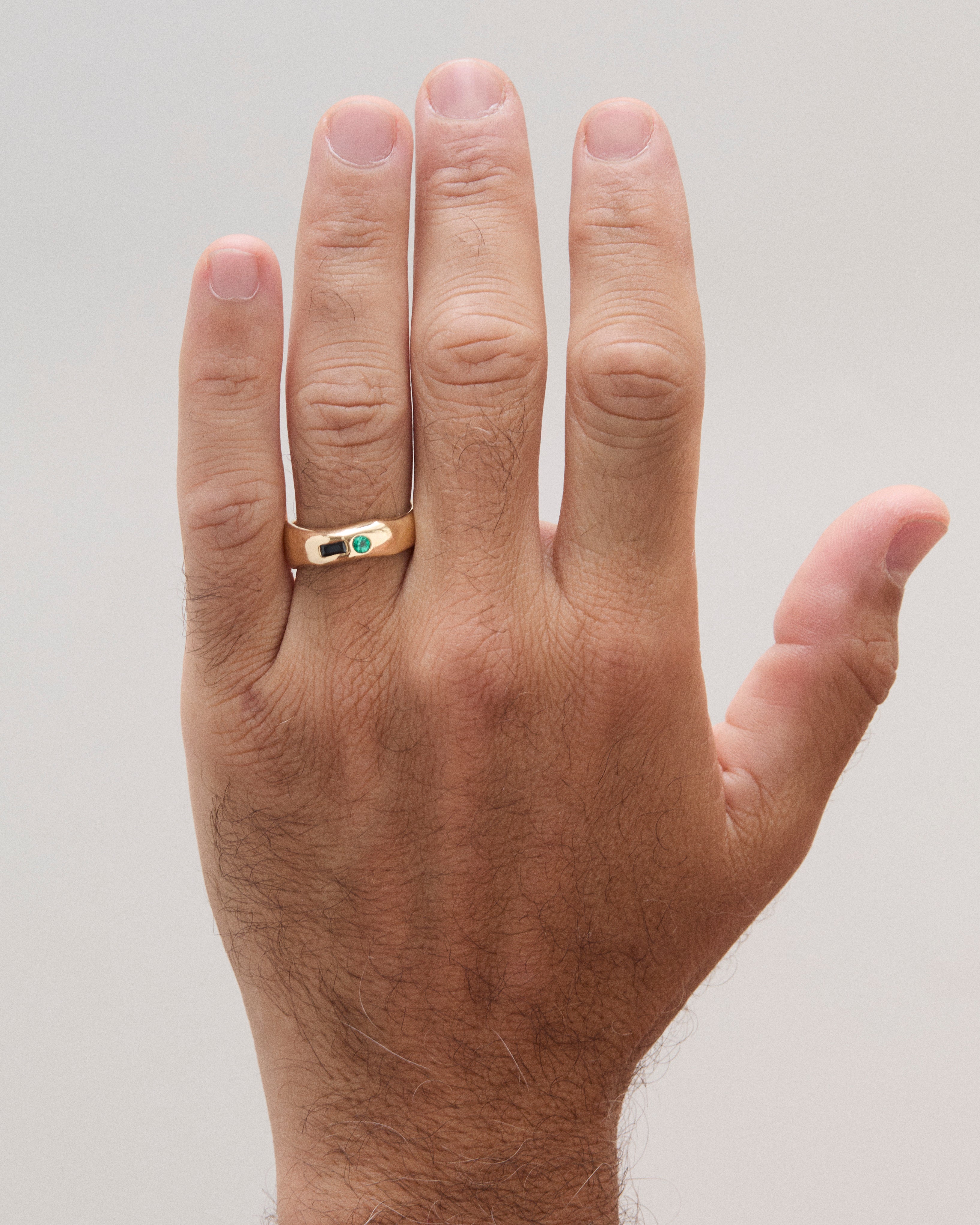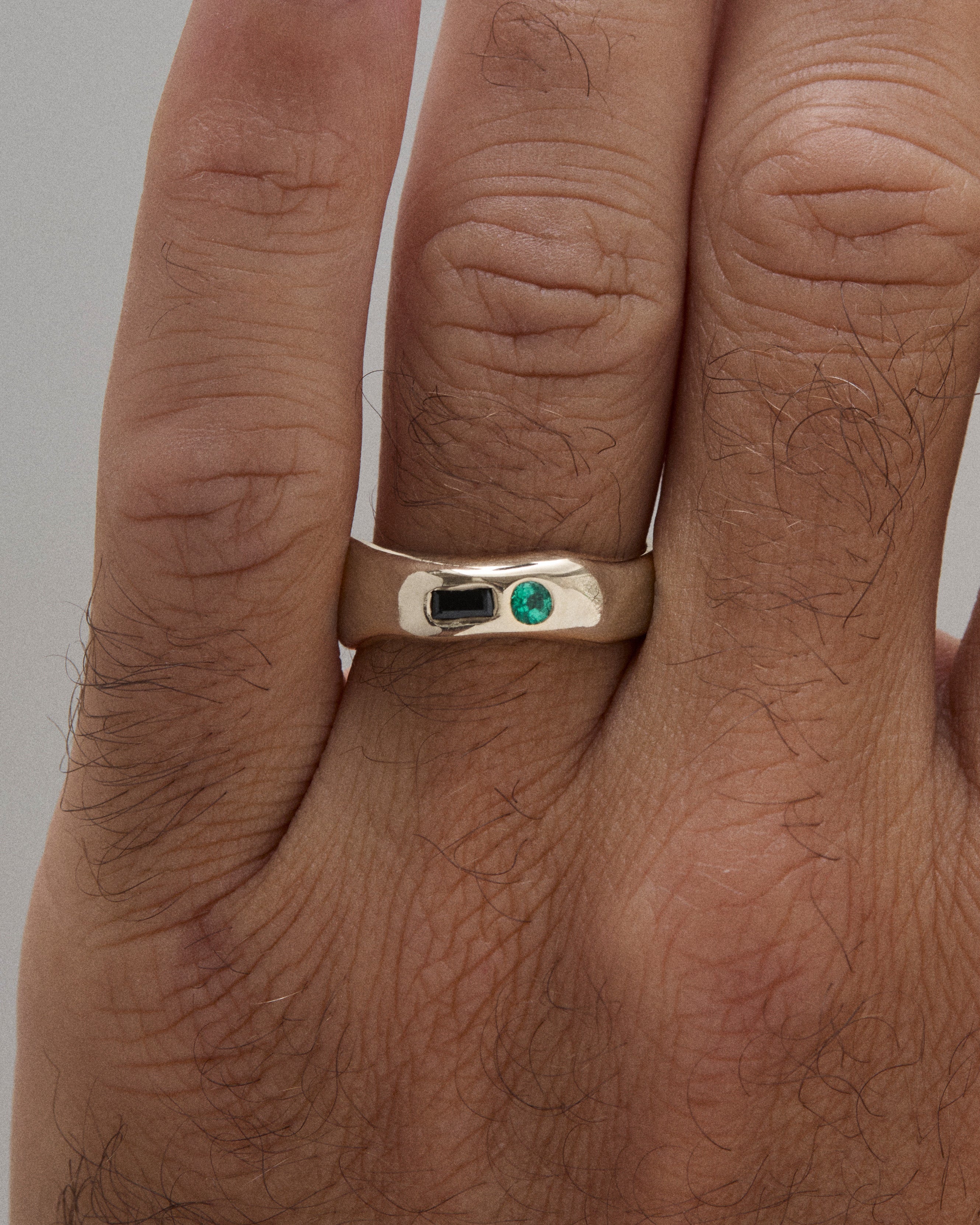 Irregular 18k gold band set with a vibrant green emerald and contrasting black spinel. A modern design that marries organic form with sophistication.
