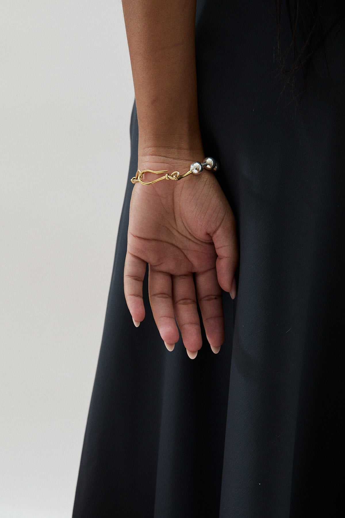 Large silver ball chain combined with brass wire to create a unique mixed metal bracelet. The bracelet closes with a cable wire hook in brass. A key player for making your silver and gold jewelry blend together.
